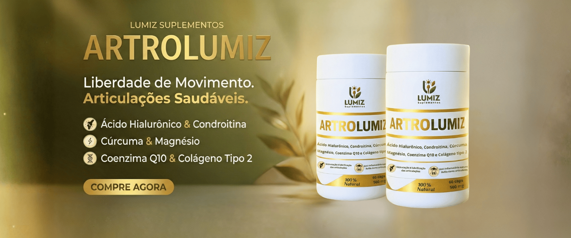 ArtroLumiz é o suplemento articular mais completo do mercado. Sua fórmula avançada combina ácido hialurônico de alta qualidade com colágeno tipo 2 e outros quatro ativos cientificamente selecionados para promover lubrificação, nutrição e fortalecimento das articulações.